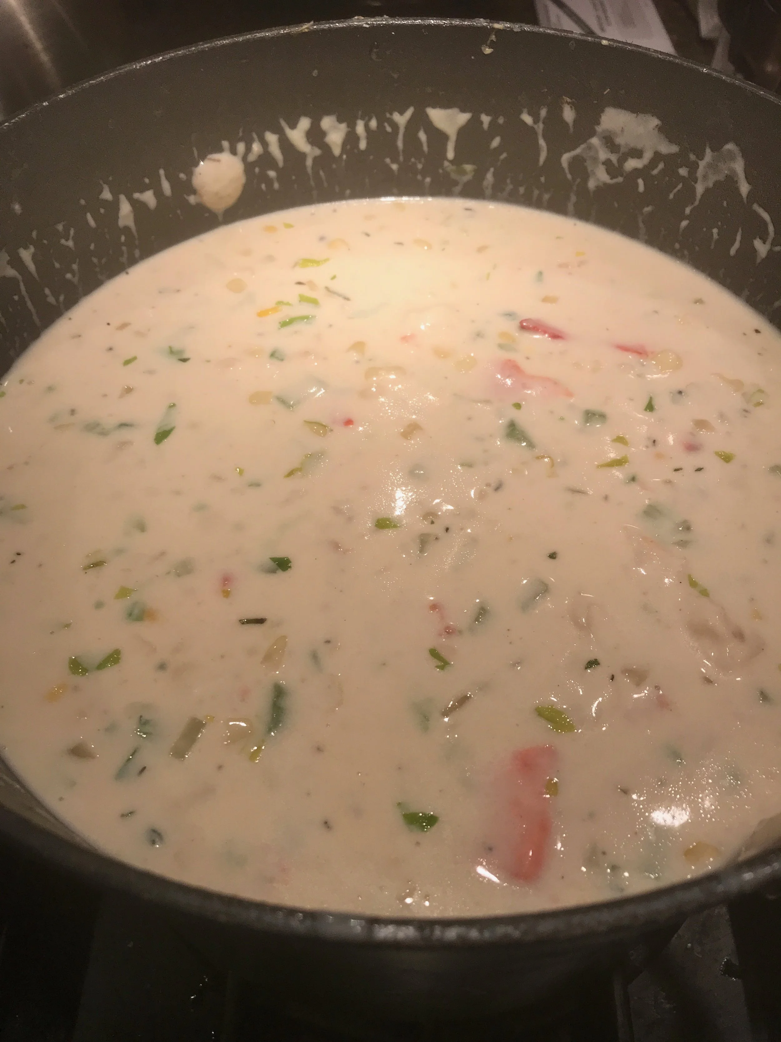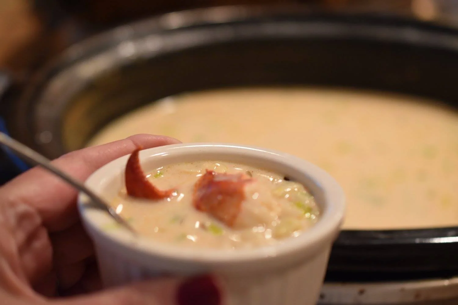 Add as much frozen white corn as you want in it, this chowder is best when chock-full of lobster and corn! Incorporate the corn, then add the least amount of heavy cream (12 - 16 oz.) as you can. The cream is for color, the stock is for flavor. Add the celery leaves. Add the lobster at the very last minute and FOR THE LOVE OF GOD DO NOT OVERCOOK THE LOBSTER! No more boil. Once the lobster is in, transfer the whole fabulous thing to a slow cooker on low and it will hang out all day. Taste again for seasoning and feel free to add more Old Bay, or even a hit of cayenne, salt and/or pepper or nothing if you love the taste. Serve it to your people and say, "You're welcome".
