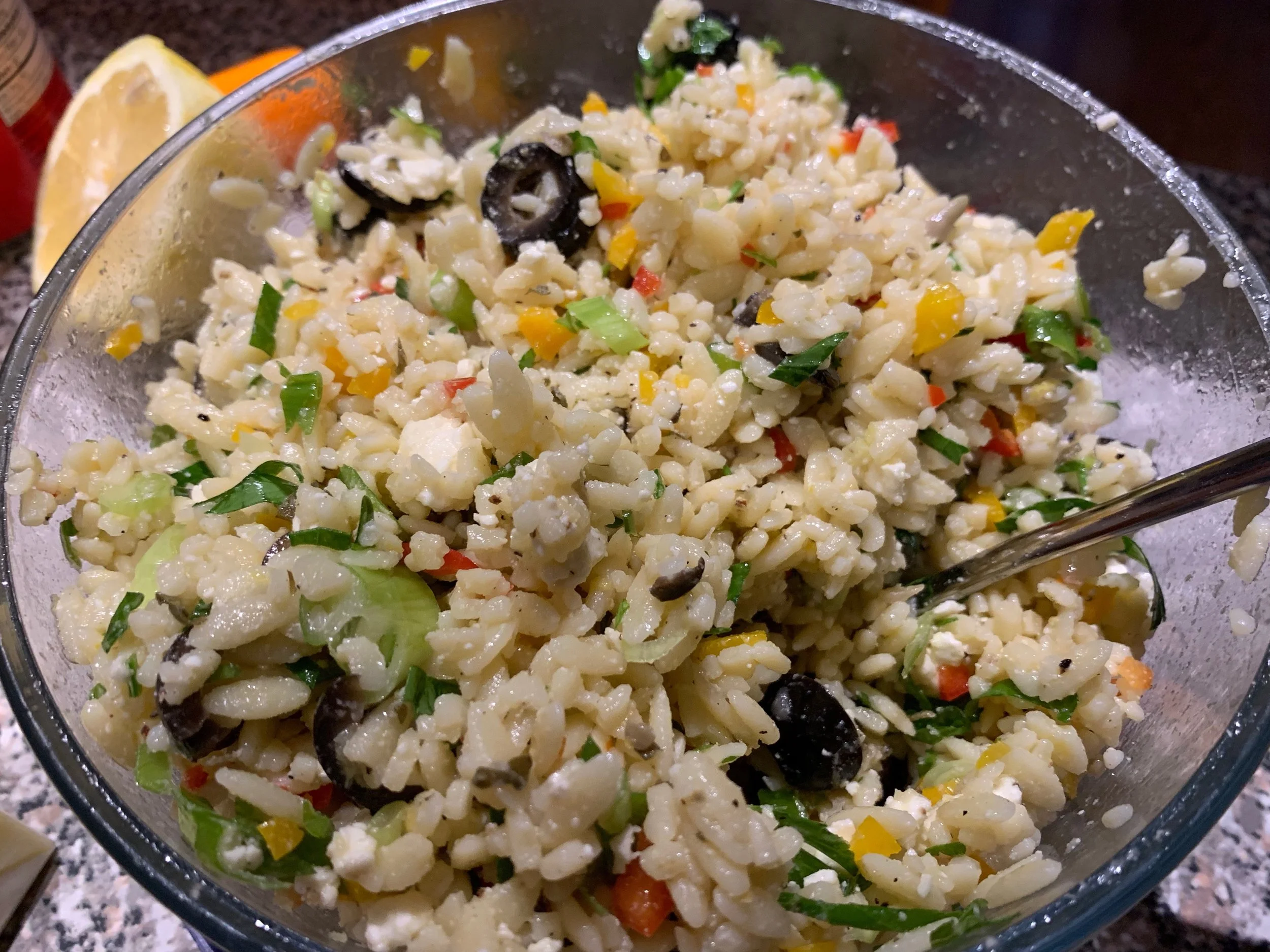 A light and delicious orzo salad with fresh veggies, feta cheese and a homemade vinaigrette. Make it the day before for a worry-free barbecue. And feel free to add the veggies you like or have on hand, see recommendations below.