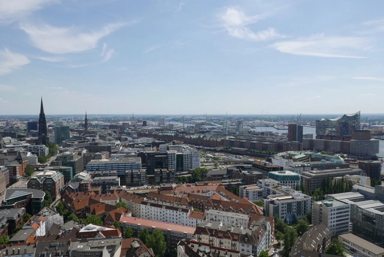 A view of Hamburg from the observation tower of St. Michael's Church, a revered and beloved landmark in Hamburg, Germany.